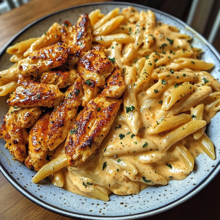 Cajun Garlic Chicken Penne is a creamy pasta dish featuring chicken strips seasoned with Cajun spices, garlic, and a rich cheese sauce.
