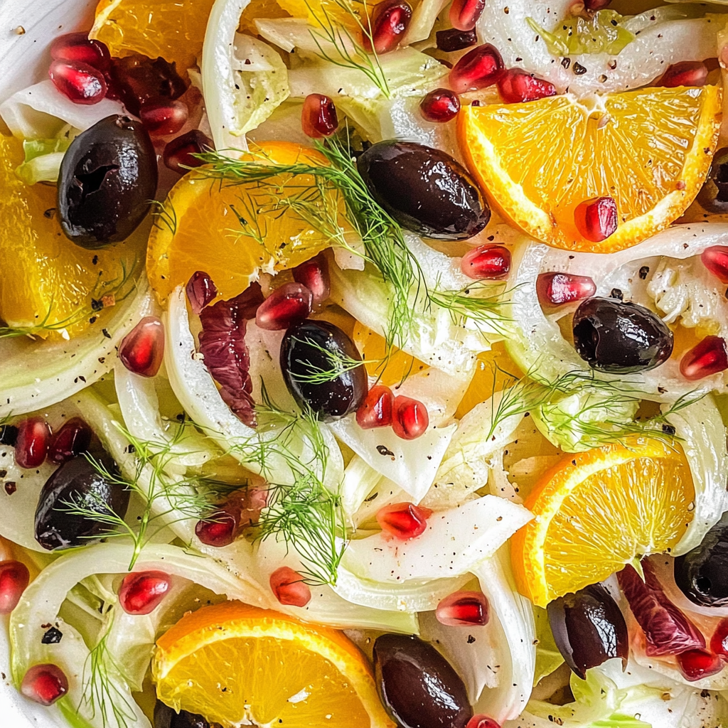 Fennel and orange salad is a refreshing dish that combines crunchy fennel with sweet oranges, often enhanced with olives and pomegranate seeds.