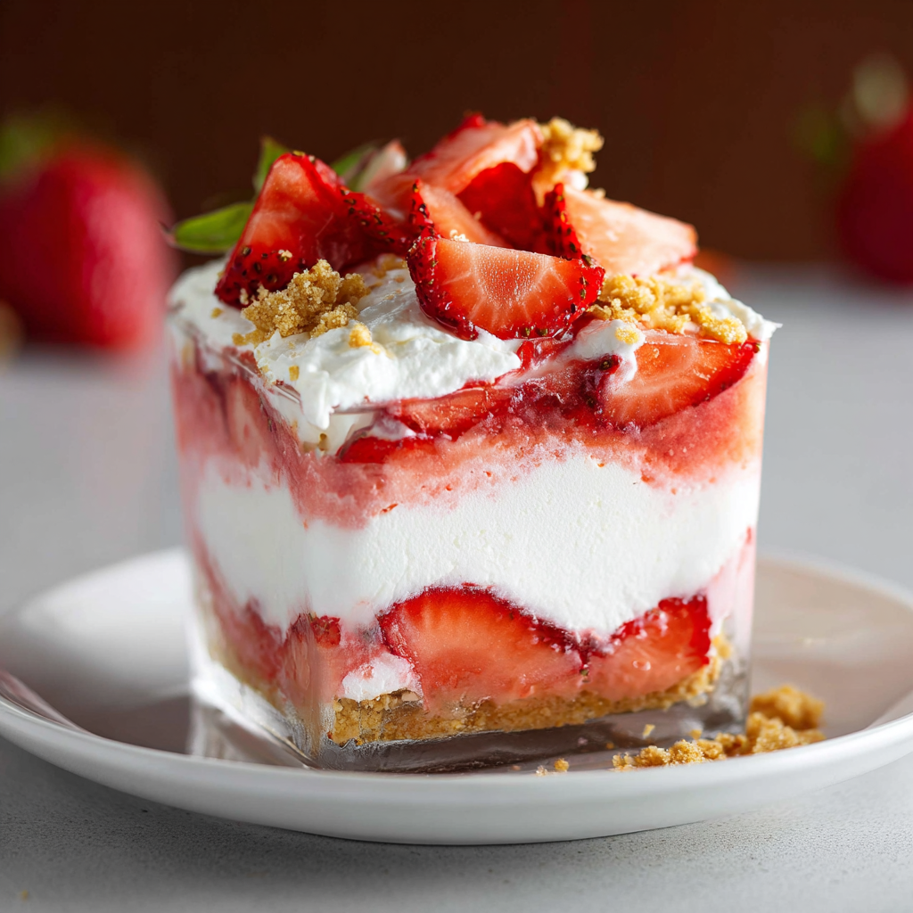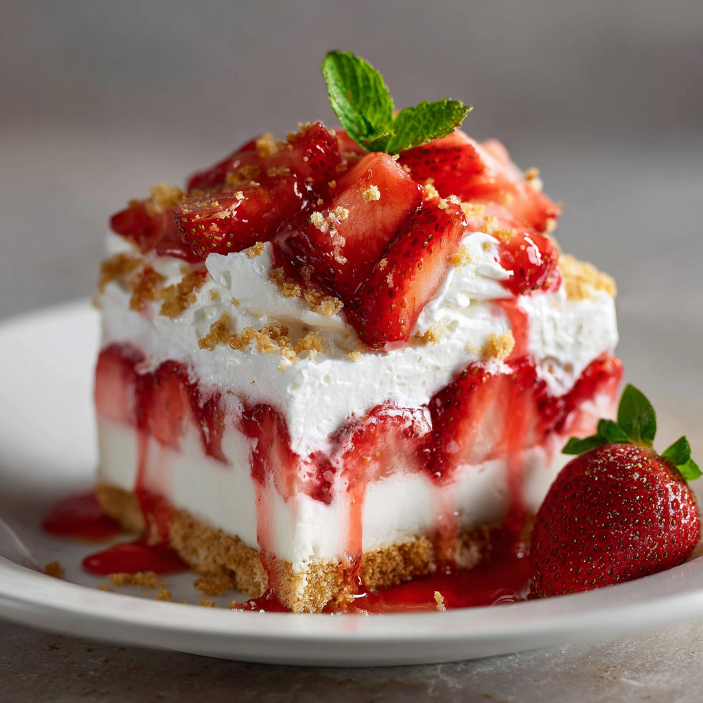 Indulge in the refreshing, creamy goodness of Strawberry Delight, a delightful no-bake dessert that’s perfect for any occasion. With its layers of fresh strawberries and rich cream cheese filling atop a buttery graham cracker crust, this dessert is sure to impress your guests and satisfy your sweet cravings. Quick to prepare and requiring no oven time, it’s an ideal choice for summer gatherings, potlucks, or family dinners. Not only does it offer a visually stunning presentation, but its velvety texture and vibrant flavors will have everyone coming back for seconds. Make this Strawberry Delight today and enjoy a treat that’s as easy to make as it is delicious!