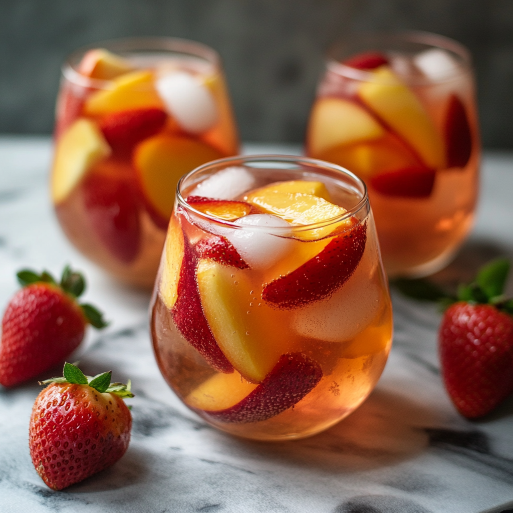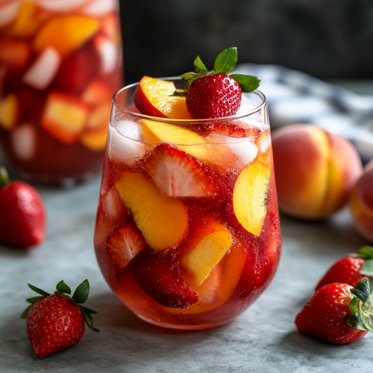 A refreshing, fruity drink with juicy peaches, sweet strawberries, and bright lemon slices — perfect for gatherings, brunch, or summer evenings. This alcohol-free version keeps all the flavor and sparkle without using wine.